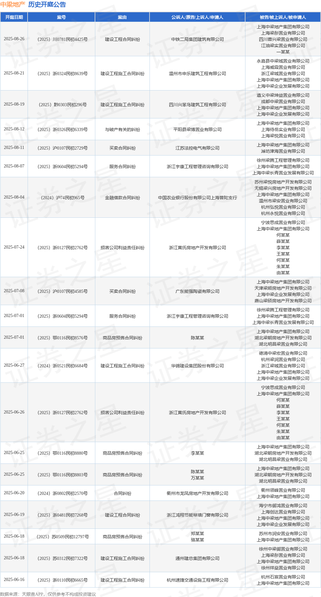 根据统计,近一年内以上海中梁地产集团有限公司为当事人的历史开庭公告有183则,其中案由为“商品房预售合同纠纷”的公告以93则居首,其次为“建设工程施工合同纠纷”有22则,“买卖合同纠纷”有21则。历史开庭公告(前20条)如下: