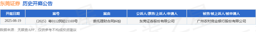 证券之星消息,根据天眼查APP显示,近日公布了一则东莞证券股份有限公司作为原告/上诉人的开庭公告,详细内容如下: