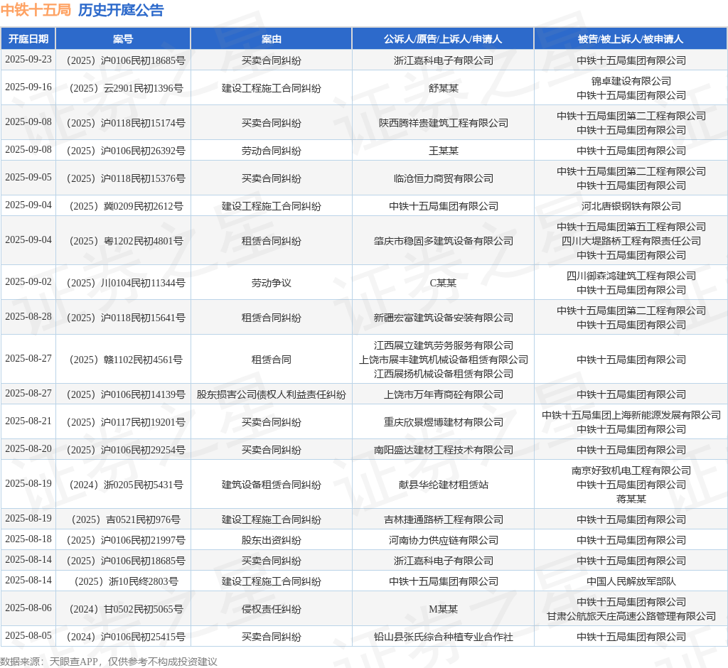 证券之星消息,根据天眼查APP显示,近日公布了一则中铁十五局集团有限公司作为被告/被上诉人的开庭公告,详细内容如下: