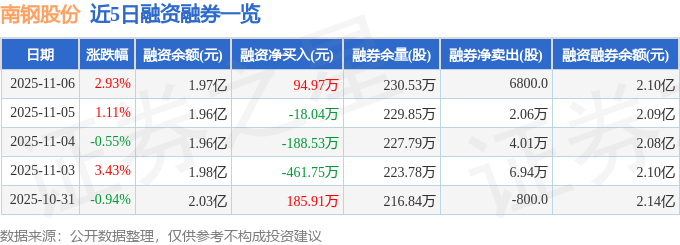 南钢股份融资融券信息显示,融资方面,当日融资买入1889.86万元,融资偿还1794.9万元,融资净买入94.97万元。融券方面,融券卖出1.23万股,融券偿还5500.0股,融券余量230.53万股,融券余额1295.58万元。融资融券余额2.1亿元。