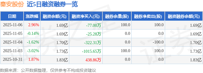 秦安股份融资融券信息显示,融资方面,当日融资买入675.68万元,融资偿还752.68万元,融资净偿还77.0万元。融券方面,融券卖出100.0股,融券偿还0.0股,融券余量100.0股,融券余额0.15万元。融资融券余额1.69亿元。