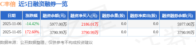 C丰倍融资融券信息显示,融资方面,当日融资买入4733.01万元,融资偿还2547.0万元,融资净买入2186.01万元,连续3日净买入累计5977.0万元。融券方面,融券卖出0.0股,融券偿还0.0股,融券余量0.0股,融券余额0.0万元。融资融券余额5977.0万元。
