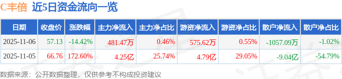 证券之星消息,截至2025年11月6日收盘,C丰倍(603334)报收于57.13元,下跌14.42%,换手率56.95%,成交量17.68万手,成交额10.41亿元。