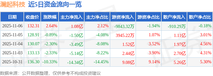 证券之星消息,截至2025年11月6日收盘,澜起科技(688008)报收于132.31元,上涨2.64%,换手率3.37%,成交量38.55万手,成交额50.66亿元。
